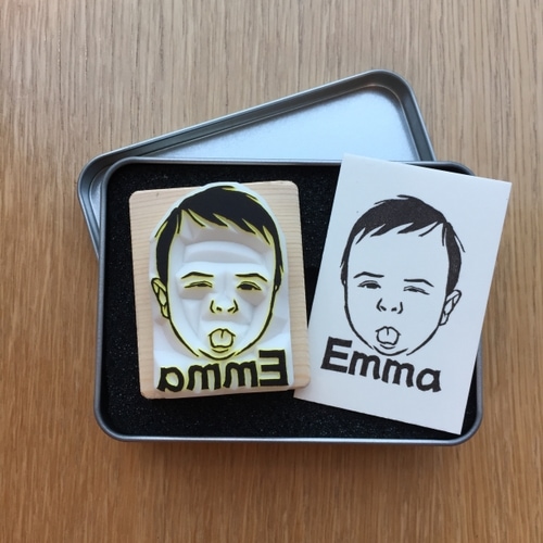 以人像相片為基礎,經過手繪及人手雕刻,製作成為印章。