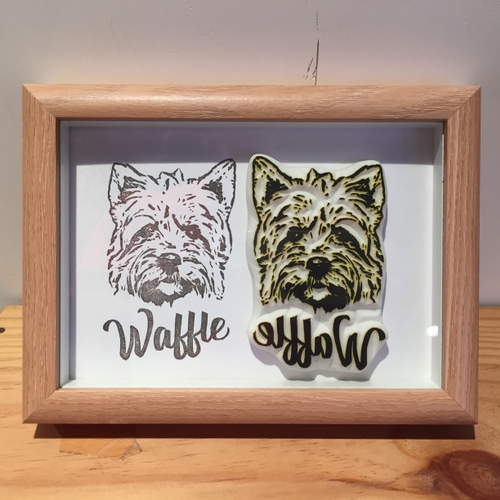 以寵物相片為基礎,經過電腦修圖及人手雕刻,製作成為印章。